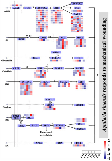 Expression analysis of genes in plant hormone signal transduction pathways in Aquilaria sinensis in response to mechanical wounding. FPKM values of the individual genes were normalized across the rows and the heatmap was visualized in R. Each row represents the normalized gene expression level, whereas columns represent different conditions.