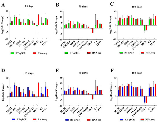 To validate the accuracy and reliability of our RNA-seq data with qRT-PCR, we randomly selected nine DEGs, which were closely related to the response to mechanical wounding. Although the gene expression levels from qRT-PCR did not exactly match the RNA-seq results, similar trends across the two datasets were observed (Figure 5). These similar expression patterns demonstrate the reliability of the data obtained by high-throughput sequencing.