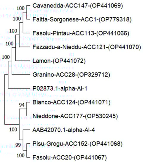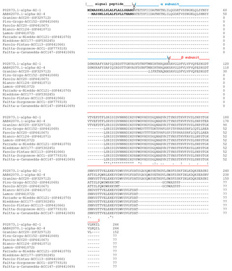 We reconstructed approximately 62% of the entire nucleotide sequence of pv28-α-AI from the Granino cultivar and approximately 30% of those of the other 9 cultivars. The nucleotide sequences obtained, compared with those deposited in the NCBI GenBank and in the EMBL-EBI databases (https://www.ebi.ac.uk/, accessed on 5 April 2023), greatly resembled several plant α-AI sequences. The greatest degree of similarity emerged from the alignment with P. vulgaris α-AI-1 (Accession No. CAD28835) and P. vulgaris α-AI-4 (Accession No U84390.1) isoforms. Once in silico translation of the nucleotide sequence into amino acids had been achieved, the primary structure obtained for each cultivar was aligned with the proteins deposited in the UniProt database (https://www.uniprot.org/uniprotkb/, accessed on 5 April 2023) to obtain information about the homology with the β-subunit of α-AI-1 (Accession No P02873.1) and α-AI-4 (Accession No AAB42070.1) of P. vulgaris.