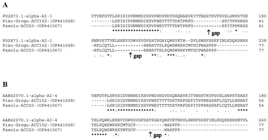 To better highlight variations in the primary structures of PV152-α-AI and PV20-α-AI, we aligned their amino acid sequences with the primary structures of the α-AI-1 and α-AI-4 isoforms. The alignment with the α-AI-1 isoform showed the presence of two gaps of 11 amino acids, extending from amino acids 161–172 and 189–200, and an identity of approximately 33% (Figure 3A). Moreover, we observed that PV152-α-AI and PV20-α-AI primary structures were more similar to isoform α-AI-4. In fact, aligning their amino acids revealed a homology percentage of approximately 40% with the isoform α-AI-4 and only one gap in the sequence (Figure 3B).