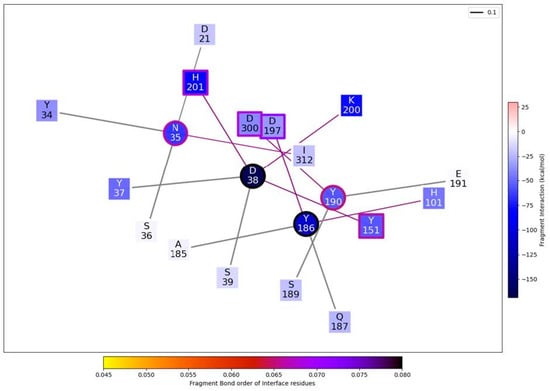 Figure 8 shows the emerging interaction network that connects the relevant residues of the α-AI sequence from P. vulgaris (P02873) with the corresponding interface residues of the porcine pancreatic amylase. The network is drawn by following the FBO between amino acids of the respective sequence. Thicker lines indicate stronger chemical bonds. Nodes are coloured following the total interaction values, and their border is based on the fragment bond order (FBO) values at the interface, as per Figure 8.