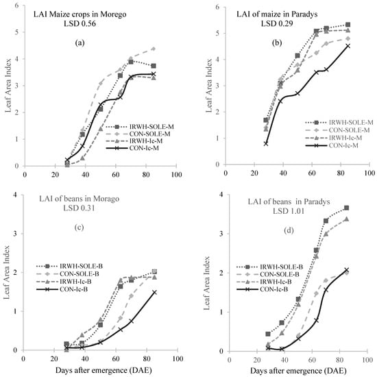 The leaf area index (LAI) for maize (M) and beans (B) growing in three cropping systems (sole-M, sole-B, and intercropping Ic) under two management practices (IRWH and CON) for both Morago (a,c) and Paradys (b,d) villages. NB: IRWH-SOLE-M and IRWH-SOLE-B = Sole maize and beans under IRWH tillage. CON-SOLE-M and CON-SOLE-B = Sole maize and beans under CON tillage. IRWH-Ic-M and IRWH-Ic-B = Intercropped maize and beans under IRWH tillage. CON-Ic-M and CON-Ic-B = Intercropped maize and beans under CON tillage.