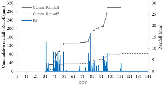 Estimation of in-field runoff (dashed line) from the rainfall (blue bars and full line for cumulative rainfall) during the growing season 2018/19 using an empirical model developed by Anderson (36).