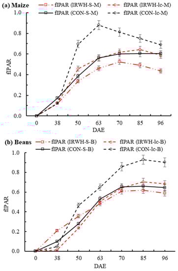 In sole and intercropped beans, a different radiation interception amount was observed compared to maize treatments (Figure 4b). In all treatments, the fIPAR was higher in beans compared to maize under both tillage systems, with a higher value in CON intercropped beans (CON-Ic-B) and peak (0.93) at 85 DAE. Similarly, in IRWH sole and intercropped beans and CON sole beans (IRWH-Ic-B, IRWH-S-B, and CON-S-B, respectively), the fIPAR reached a peak between 70 and 85 DAE with fIPAR values of 0.70, 0.66, and 0.62. Similar to maize, the CON-S-B showed the highest fIPAR values compared to the other three treatments (IRWH-Ic-M, IRWH-S-B, and CON-S-B), but the CON-Ic-B showed higher values at the early stage until 50 DAE.