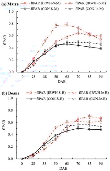 In the Paradys demonstration plots (Figure 5a,b), the fIPAR for sole maize under IRWH (IRWH-S-M) increased sharply from DAE 38 to 63 DAE, with the highest peak value of 0.77, but the sole maize under CON (CON-S-M) showed lower intercepted fraction and peaked at 50–63 DAE compared to IRWH (Figure 4a). However, both intercropped maize under CON and IRWH (CON-Ic-M and IRWH-Ic-M) peaked at 63 and 70 DAE, with fIPAR values of 0.49 and 0.64. There were large variations in fIPAR between sole and intercropped maize for both CON and IRWH tillages. In Paradys demonstration plots (Figure 5b), the intercepted fraction (fIPAR) of sole beans under IRWH (IRWH-S-B) increased slowly to the maximum interception (70% at 85 DAE), and the value of fIPAR was greater by 14%, 20%, and 9% compared to CON-Ic-B, CON-S-B, and IRWH-Ic-B, respectively. In general, the architecture of the canopy, which was affected by crop densities, crop height, and row arrangement, could be the deciding factor for crop intercepted PAR. The separation of the maize upper canopy in the intercropping led to more intercepted PAR of beans compared to the sole cropping. Moreover, the distance between maize tramlines under IRWH was also another issue for radiation interception advantageous to the increase in intercepted PAR for the short crop canopy.