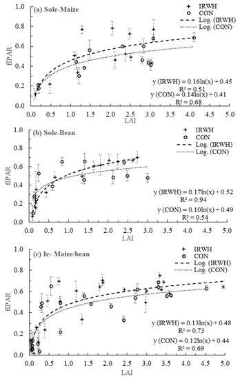 The logarithmic relationship between LAI and fraction intercepted photosynthetic active radiation (fIPAR) for different cropping systems; (a) sole maize, (b) sole beans, and (c) intercropping under CON and IRWH tillage systems.