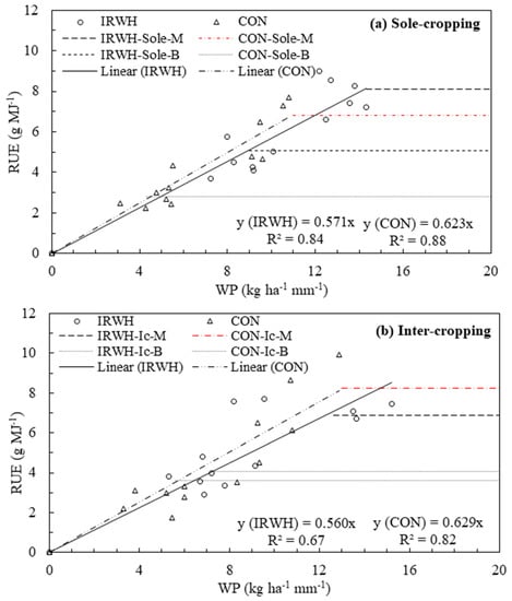 Relationship between water productivity (WP) and radiation use efficiency (RUE) among cropping systems (sole-M, sole-B, and intercropping-Ic) under two different tillage systems (CON and IRWH); WP and RUE were derived as the slope of the regression of AGDM on cumulative water use and radiation use, respectively during the growing season. (a) Sole cropping and (b) Intercropping.