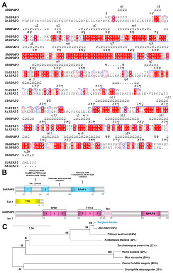 SbRPAP3 sequence alignment, domains, and phylogeny. (A) Sequence alignment. Accession numbers: SbRPAP3 (C5YZG3) and AtRPAP3 (Arabidopsis thaliana; A0A5S9WQJ7). Sequences were aligned using Clustal Omega and illustrated using ESPript software that shows alpha-helices as coils at the top of the alignment. (B) Domains of SbRPAP3, Tah1, and HsRPAP3. The predicted domains of SbRPAP3 using Prosite indicated a TPR domain from residues 38 to 138. InterPro 79.0 (EMBL) analysis confirmed the characteristic TPR domain from 38 to 138 and a RPAP3 domain from residues 263 to 351, and the later was also confirmed using Pfam analysis. Tah1 and HsRPAP3 and their domains are also shown for comparison. (C) Phylogenetic analysis of SbRPAP3 with orthologs from yeast to human. Bootstrap values from 1000 replicates were assigned to nodes to indicate their statistical support. The scale bar represents the average number of substitutions per site along each branch. Additionally, the percentage of sequence identity for each ortholog, compared to SbRPAP3, is provided for reference.