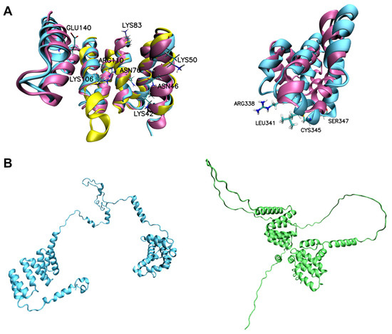 Structural alignment of SbRPAP3 domains. (A) High-resolution structures for the TPR domains of both Tah1 ((left); yellow, 2LSU, RMSD of 1.25 Å) and HsRPAP3 ((left); magenta, 6FDT, RMSD of 1.06 Å) and for the RPAP3 domain of HsRPAP3 ((right); magenta, 6EZ4, RMSD of 1.65 Å) are shown. SbRPAP3 domains are in cyan. Key residues at the TPR domain (right) that are involved in binding to Hsp90 and Hsp70, and at the RPAP3 domain (left) that are involved in binding to RUVBLs, are highlighted (see references [7,21] for more details). (B) SbRPAP3 structural models obtained using the deep-learning-based structure prediction methods: RoseTTaFold ((left), cyan) and AlphaFold2 ((right), green).