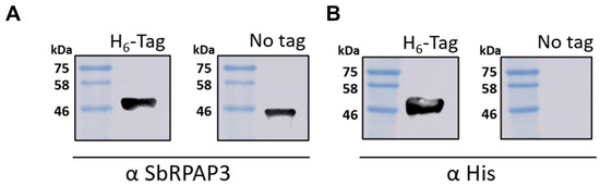 Western blot (WB) analysis was used to demonstrate the efficiency of TEV protease cleavage at 4 °C overnight. (A) Blot probed with a rabbit anti-SbRPAP3 polyclonal antibody at a dilution of 1:5000 for two hours. The presence of SbRPAP3 is evident in both the “H6-Tag” and “No tag” lanes, indicating successful expression and cleavage of the His-tag. (B) The same blot from panel A, but probed with a mouse anti-His monoclonal antibody at a dilution of 1:5000 for one hour. This antibody specifically detects the His-tag. The results demonstrate the efficient removal of the His-tag, as indicated by the absence of the His-tag signal in the “No tag” lane. These Western blot analyses confirm the successful cleavage of the His-tag from SbRPAP3, validating the purification process.