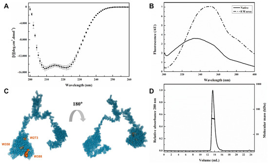 Spectroscopic and hydrodynamic analysis of SbRPAP3. Experiments were performed in Tris-HCl 25 mmol L−1 (pH 7.4) and NaCl 200 mmol L−1 buffer at 25 °C. (A) Circular dichroism spectrum. The data normalized to molar residue ellipticity ([θ]) shows that SbRPAP3 presents minima at 208 and 222 nm and a positive band at about 200 nm, characteristics of an α-helix-rich secondary structure. (B) Intrinsic fluorescence emission spectra, showing the shift in the emission λmax when SbRPAP3 was exposed to 8 mol L−1 urea. (C) Position of the tryptophan residues. Modelled SbRPAP3 structure (VDWD glass1 outfit) with Trp (VDWD outfit) highlighted in orange. (D) SEC-MALS-QELS chromatogram, showing the calculated molecular mass of 41.7 ± 0.3 kDa.