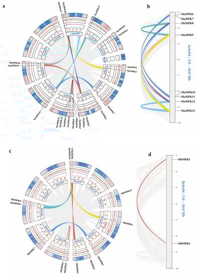 Collinear analysis of the whole genome was used to understand gene duplication events of the MPK gene family. Meanwhile, unknown base content, GC content, and gene density data were supplemented as references. Unfortunately, the Musa itinerans and Musa textilis genomes were not assembled to the pseudochromosome level, meaning only Musa acuminata, Musa balbisiana, and Musa schizocarpa were analyzed (Figure 3). There were eight, six, and three segmental duplications and eight, zero, and three tandem duplications observed between the MPK family of Musa acuminata, Musa balbisiana, and Musa schizocarpa, respectively (Figure 3a,c,e). Interestingly, the 3–10 MB regions of Chr04 in Musa acuminata and Musa schizocarpa were discovered through eight and three times of segmental duplication, respectively (Figure 3b,f), but were not found in this region of Musa balbisiana (Figure 3d). The interspecific features of MbMPKs may come into being from long-term evolution and natural selection. These gene duplication events may refer to the functional differentiation and expansion of the MPK gene family in bananas.