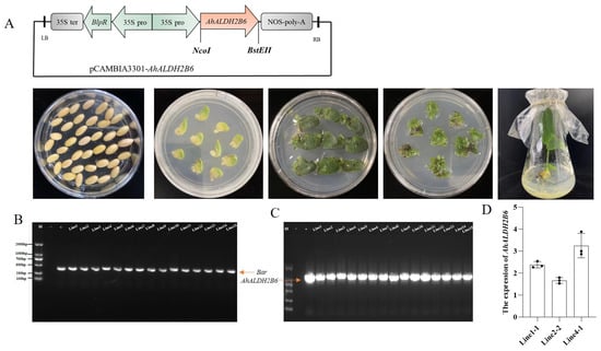 The pCAMBI3301-AhALDH2B6 recombinant plasmid was transformed into Agrobacterium EHA101. Regenerated plants expressing pCAMBI3301-AhALDH2B6 were obtained, as previously described [32,33]. Genomic DNA was extracted from transgenic progeny, and positive plants were identified through PCR using corresponding primers (Supplemental Table S1).