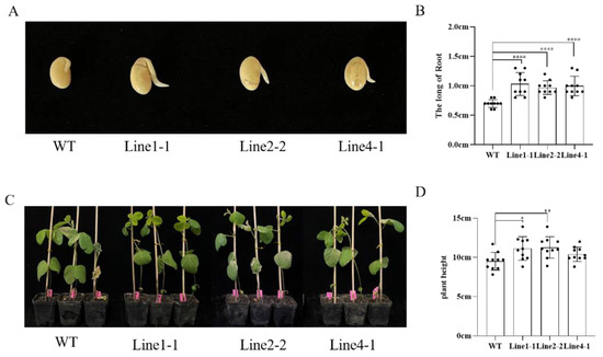 Low-temperature stress phenotypes of transgenic soybean. (A,B) Phenotype and root length of transgenic soybean and P3 under low-temperature treatment at the germination stage. (C,D) Phenotype and plant height of transgenic soybean and P3 under low-temperature treatment at the emergence stage * p < 0.05, ** p < 0.01, **** p < 0.0001.