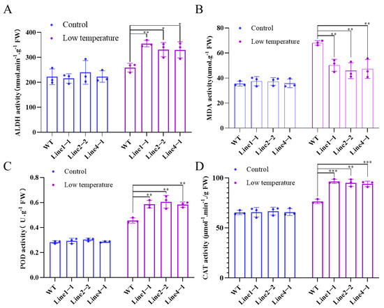 To explore the stress resistance of AhALDH2B6 further, we overexpressed AhALDH2B6 in soybean via Agrobacterium-mediated transformation. The AhALDH2B6 coding sequence was driven by the 35S promoter (Figure 2A). Fifteen transgenic soybean plants were obtained in T0, all of which were confirmed by PCR to have the expected size of the selection marker, bar gene (422 bp), and target gene, AhALDH2B6 (1272 bp) (Figure 2B,C). After three generations of propagation, three homozygous overexpression lines were obtained, named line 1-1, line 2-2, and line 4-1. After 9 d of low-temperature treatment, AhALDH2B6 was found to be highly expressed in lines 1-1, 2-2, and 4-1 (Figure 2D).