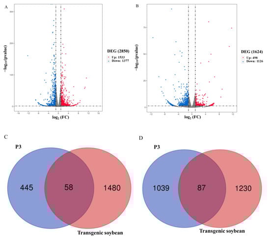 Comparison of differentially expression genes (DEGs) between transgenic lines and P3 under low and normal growth temperatures. (A) DEGs analyzed in transgenic soybeans under cold stress compared to 25 °C growth conditions. (B) DEGs analyzed in P3 soybeans under cold stress compared to 25 °C growth conditions. (C) Up-regulated DEGs in transgenic and P3 soybeans. (D) Down-regulated DEGs in transgenic and P3 soybeans.