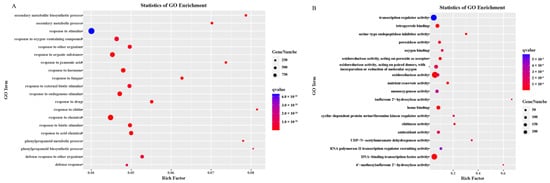 We performed a GO analysis of DEGs to investigate their functions, focusing on the specific 1480 up-regulated and 1230 down-regulated genes in transgenic soybean. Significant GO terms were enriched in response to stimulus (GO:0050896), response to chemical (GO:0042221) for 1480 up-regulated DEGs in terms of biological process (BP), followed by response to organic substance (GO:0010033), response to endogenous stimulus (GO:0009719) and response to oxygen-containing compound (GO:1901700) (Figure 6A). For molecular function, significant GO terms were enriched in oxidoreductase activity (GO:0016491) and transcription regulator activity (GO:0140110) (Figure 6B).
