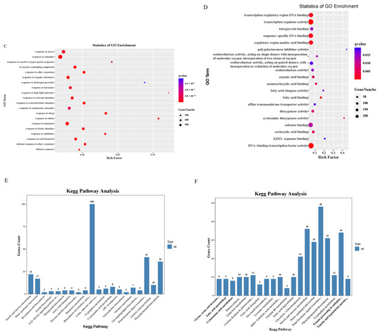 The R package AnnotationHub (version 3.6.0) was used to obtain the annotation information files for soybean in the database. Using the R package ClusterProfiler (v4.6.0), down-regulated and up-regulated differentially expressed genes (DEGs) lists were analyzed for gene ontology (GO) gene function clustering and enrichment. Using the R package ClusterProfiler (v4.6.0), KEGG pathway annotation analysis of differentially expressed genes was performed, the metabolic pathways of gene products in cells were systematically analyzed, and the function of these gene products was determined.
