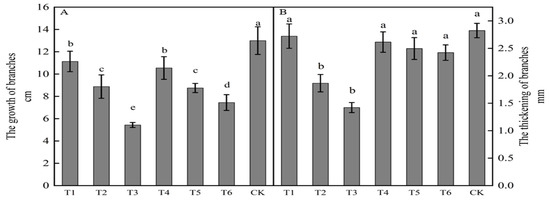 Effects of growth regulators on new bud growth and thickening. The numbering of the horizontal axis is the same as Table 1. (A)The growth of branches. (B) The thickening of branches. Different lowercase letters represent significant differences at p < 0.05.