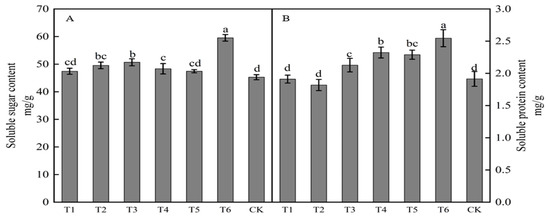 The spraying of growth regulators affected the soluble sugar content of buds (Figure 2A). The soluble sugar content in buds from highest to lowest with different treatments was in the order T6 > T3 > T2 > T4 > T5 > T1 > CK. Results for treatments T6, T3, T2, and T4 were significantly higher than those in the control, with increases of 31.51, 11.93, 9.44, and 6.75%, respectively. The spraying of growth regulators also affected the soluble protein content of buds (Figure 2B). The soluble protein content following treatments T1 and T2 was lower than that in the control, whereas the soluble protein content with the other four treatments was higher than that in the control. The soluble protein content in buds from highest to lowest with different treatments was in the order T6 > T4 > T5 > T3 > CK > T1 > T2. Treatments T6, T4, T5, and T3 were significantly higher than that in the control, with increases of 33.00, 21.39, 19.64, and 11.15%, respectively. Treatments T3, T4, and T6 significantly increased both the soluble sugar and protein contents in buds.