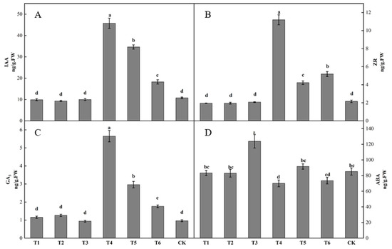 Effect of growth regulators on endogenous hormone content in buds. The numbering of the horizontal axis is the same as Table 1. (A) IAA content. (B) ZR content. (C) GA3 content. (D) ABA content. Different lowercase letters represent significant differences at p < 0.05.