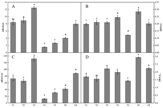 Effect of growth regulators on the ratio of endogenous hormones in buds. The numbering of the horizontal axis is the same as Table 1. (A) ABA/IAA. (B) ZR/IAA. (C) ABA/GA3. (D) ZR/GA3. Different lowercase letters represent significant differences at p < 0.05.