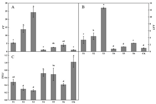 Substantial differences were present in the relative expression of FT in buds after spraying plant growth regulators (Figure 5A). The relative expression of FT following the T3 treatment was the highest, being significantly higher than that following the other treatments. The relative expression of FT following the T2 treatment was significantly higher than those following the T1, T2, T4, T5, or T6 treatments or in the control. The relative expression of FT following the T1 treatment was significantly higher than those following the T4 or T5 treatments and in the control. The relative expression of FT following the T1, T2, T3, T4, T5, and T6 treatments were all higher than in the control, by 425.49, 1239.34, 2273.41, 2.77, 157.73, and 297.97%, respectively.