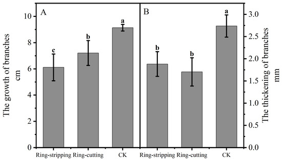 Effects of ring-stripping and ring-cutting on new buds growth and thickening. (A) The growth of branches. (B) The thickening of branches. Different lowercase letters represent significant differences at p < 0.05.