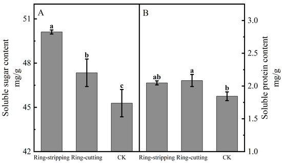 Effects of ring-stripping and ring-cutting on bud soluble sugar and soluble protein content. (A) The bud soluble content. (B) The bud soluble protein content. Different lowercase letters represent significant differences at p < 0.05.