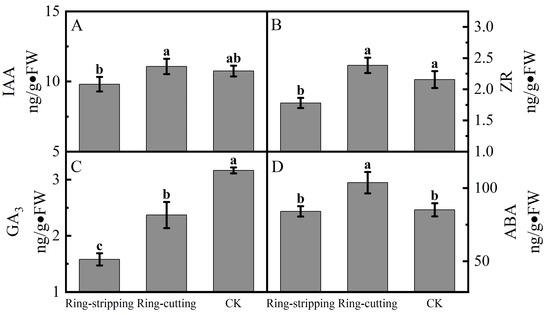 Effects of ring-stripping and ring-cutting on endogenous hormone content in buds. (A) IAA content. (B) ZR content. (C) GA3 content. (D) ABA content. Different lowercase letters represent significant differences at p < 0.05.