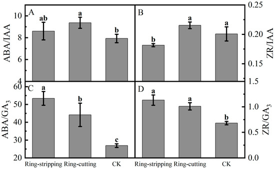 Effects of ring-stripping and ring-cutting on the ratio of endogenous hormones in buds. (A) ABA/IAA. (B) ZR/IAA. (C) ABA/GA3. (D) ZR/GA3. Different lowercase letters represent significant differences at p < 0.05.