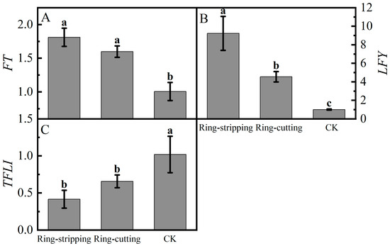 Effects of ring-stripping and ring-cutting on the expression of FT, LFY, TFL1 in buds. (A) The expression of FT. (B) The expression of LFY. (C) The expression of TFL1. Different lowercase letters represent significant differences at p < 0.05.