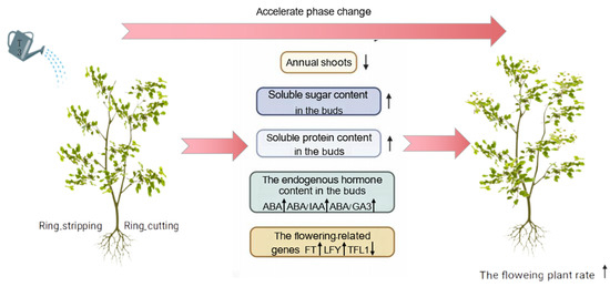 Based on the research results, a regulatory model was proposed for the optimal combination of growth regulators, and ring-stripping and ring-cutting treatments to promote the phase change of pear seedlings (Figure 11).