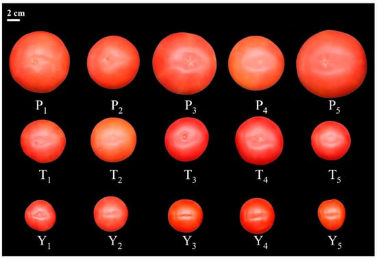 Tomato fruit varieties used in this study: P1, Huachen 70; P2, Yinfeng 79; P3, Puluowangsi; P4, Hunshuo 188; P5, Dongfeng 199; T1, Zhengfan P190; T2, Zhengfan P210; T3, Youyou 2045; T4, Gaotang 100; T5, Yuanwei No.1; Y1, Pink Baby; Y2, Bay Butter; Y3, Red Bean; Y4, Hongmei 1850; Y5, Juan-zhulian.