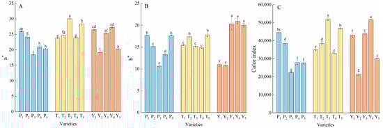 The a* values (A), b* values (B), and color indexes (C) of the tomatoes. Data represent the mean ± SE. Different lowercase letters indicate statistical significance by Duncan’s multiple range test (p < 0.05). P, regular tomatoes; T, tasty tomatoes; Y, cherry tomatoes.