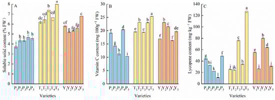 The soluble solids (A), vitamin C (B), and lycopene (C) contents in tomato fruits. Data represent the mean ± SE. Different lowercase letters indicate statistical significance by Duncan’s multiple range test (p < 0.05). P, regular tomatoes; T, tasty tomatoes; Y, cherry tomatoes.