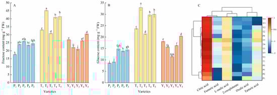 The contents of fructose (A), glucose (B), and organic acids (C) in tomato fruits. Data in (A,B) represent the mean ± SE. Different lowercase letters indicate statistical significance by Duncan’s multiple range test (p < 0.05). The colored areas in (C) correspond to the content of acids from high (red) to low (blue). The data were log2 transformed and standardized. Euclidean distance and average linkage were used to construct the clustering of acids and varieties. P, regular tomatoes; T, tasty tomatoes; Y, cherry tomatoes.