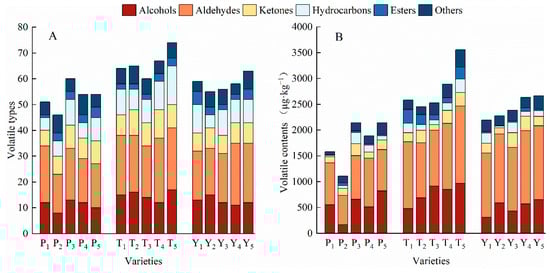 The types (A) and contents (B) of volatile compounds in tomato fruits. P, regular tomatoes; T, tasty tomatoes; Y, cherry tomatoes.