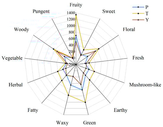 The aroma shape of the three types of tomato based on the characteristic aroma components with the odor activity values (OAVs). P, regular tomatoes; T, tasty tomatoes; Y, cherry tomatoes.