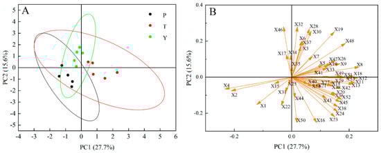 Principal component analysis (PCA) of tomato samples with a different score plot and loading plot. Circles in (A) are 95% confidence ellipses. The arrow in (B) indicates the loadings. P, regular tomatoes; T, tasty tomatoes; Y, cherry tomatoes.