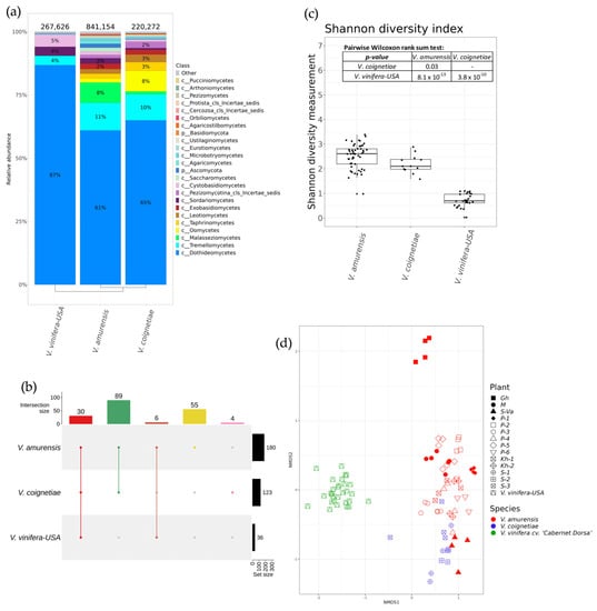 - Aleynova, O.A.; Nityagovsky, N.N.; Suprun, A.R.; Ananev, A.A.; Dubrovina, A.S.; Kiselev, K.V. The Diversity of Fungal Endophytes from Wild Grape Vitis amurensis Rupr. Plants 2022, 11, 2897. [Google Scholar] [CrossRef]