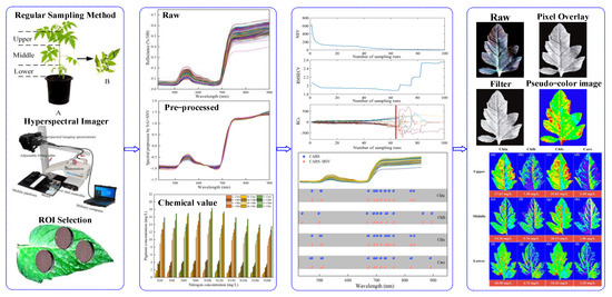 This work aimed to use VNIR–HSI technology to simultaneously measure and visualize the distribution of the pigment concentration in Lycopersicon esculentum Mill. leaves. More specifically, the research objects were the leaves of Lycopersicon esculentum Mill. seedlings cultivated in nutritional solutions with variable nitrogen concentrations at various leaf positions. Figure 1 shows the schematic diagram of this work.