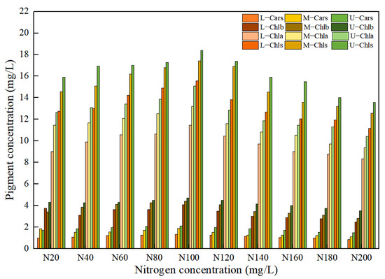 The different nitrogen concentrations in the nutrient solution caused significant differences in the pigment concentration of the leaf positions for Lycopersicon esculentum Mill, as shown in Figure 2. The maximum growth rate with the increasing concentration was 7.32%, 11.56%, 7.70% and 10.44% for Chla, Chlb, Chls and Cars, respectively, at nitrogen concentrations below N100 (302.84 mg/L). When the nitrogen concentration was greater than N100, the maximum rate of decline with the increasing concentration reached 11.32%, 12.46%, 11.63% and 8.56%, respectively. As a result, the maximum amount of leaf pigment and the optimal nitrogen concentration for the Lycopersicon esculentum Mill. seedlings was 302.84 mg/L in the nutrient solution. Meanwhile, the inhibitory effect of a high concentration was stronger than that of a low concentration. As nitrogen is readily translocated in the plant organism, the concentration reduction rates from Upper to Middle for Chla, Chlb, Chls and Cars were 11.48%, 15.13%, 7.55% and 18.22%, respectively. The reduction rates from Middle to Lower were 15.47%, 12.41%, 14.13% and 22.52%, respectively. Therefore, the distribution pattern of the leaf pigment concentration was Upper > Middle > Lower. This conclusion is the absorption of nutrient elements through the photosynthesis of crops.