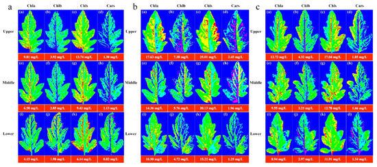Visualization of pigment concentration and distribution pattern of leaf positions under cultivation with different nitrogen concentrations. (a) Visualization of leaf pigments under N60 cultivation; (b) Visualization of leaf pigments under N100 cultivation; (c) Visualization of leaf pigments under N140 cultivation. (blue represents the minimum value and red represents the maximum value).