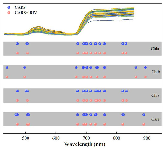 Figure 5 depicts the distribution of the characteristic variables extracted using the CARS and CARS–IRIV algorithms. The characteristic wavelengths of Chla, Chlb, Chls and Cars were mainly concentrated at 435–510 nm, 660–760 nm and 800–895 nm. And all have 691, 702, 715, 730 and 760 nm selected. In the visible spectral region, Chla, Chlb and Chls mainly absorb blue, purple and red light, with two strong absorption regions at 400–460 nm and 630–680 nm [5,8,31,32]. Cars mainly absorbs blue and purple light, which is a strong absorption region at 400–500 nm [5,10,33,34]. In the near-infrared spectral region, it is mainly caused by the absorption of water or oxygen. Notably, Chla, Chlb, Chls and Cars have overlapping bands selected. The visible region is due to the action of the chromogenic group (C=O, C=C, C≡C) and chromatic group (–OH) [35,36,37,38,39]. In the near-infrared region, it was mainly affected by the O–H bond and O2 inside the blade, the double frequency and triple frequency, as well as the combined frequency of the stretching vibration of the C–H group [40].