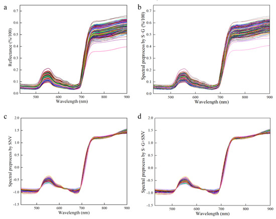 Spectral data contain not only the informative concentration, but also a significant amount of redundant and interfering information. Preprocessing, as a crucial step in data refinement, is utilized to adjust the variability of each measured variable and its relationship to better align with the objectives of the data analysis. The selection and combination of preprocessing methods are dependent on the unique characteristics of the data and the goals of the analysis process. Spectrum stability is always influenced by leaf gloss, leaf reflection, background interference and baseline drift during the scanning process. The Savitzky–Golay smoothing filter (S–G) is capable of mitigating the impact of interfering factors, such as the signal-to-noise ratio and dark current, thereby enhancing the accuracy and reliability of the data analysis [44,45]. The standard normal variable (SNV) is primarily employed to eliminate the effects of particle size, surface scattering and light path variation on diffuse reflection spectra [18,46]. Therefore, the effective spectrum was preprocessed using the S–G, SNV and S–G + SNV approaches, which reduced interference before modeling and effectively improved the prediction accuracy of the model, as shown in Figure 6.