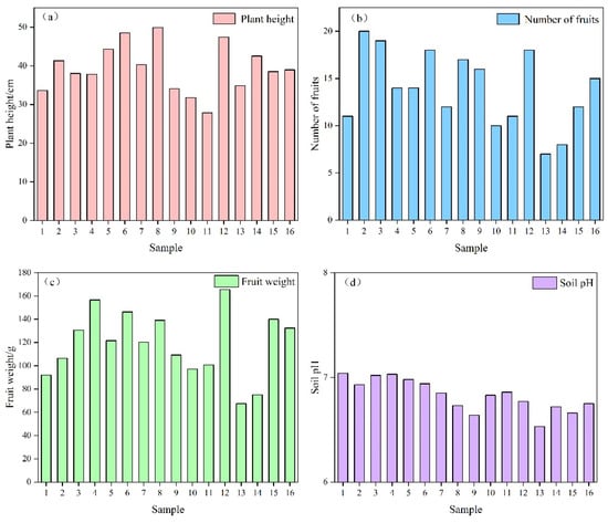As can be seen from Figure 1, The highest PLI plant height in the 8th group was 49.87 cm, while the lowest PLI plant height in the 11th group was 27.83 cm; the highest number of PLI fruits in the 2nd group was 20, and the lowest number of PLI fruits in the 13th group was 7; the highest PLI fruit weight in the 12th group was 165.47 g, and the lowest PLI fruit weight in the 13th group was 67.50 g. Most of the soil pH was weakly acidic except for groups 1, 3 and 4.