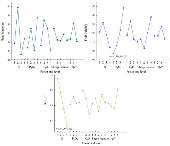 (2) The effect order of fertilization on fruit weight of PLI was P2O5 > sheep manure > N > K2O > Pb2+; The horizontal combination of factors that promoted PLI fruit weight to reach the maximum value were N (0.15 g·kg−1), P2O5 (0.225 g·kg−1), K2O (0.15 g·kg−1), sheep manure (9 g·kg−1), Pb2+ (100 mg·kg−1).