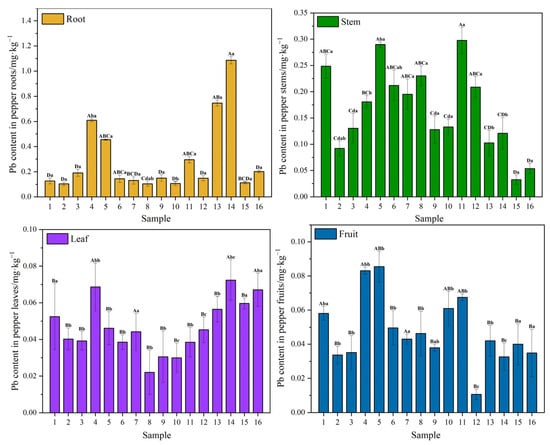 In addition, the difference between groups in the same part of PLI under different treatments was as follows: the Pb content of group 14 in the root was significantly different from that of group 7 and group 15; Pb content in the stems of group 11 was significantly different from that in the stems of group 4. Pb content in leaf group 7 was significantly different from that in groups 1, 2, 3, 5, 6, 8, 9, 10, 11, 12, 13 and 15. Pb content in fruit group 7 was significantly different from that in groups 2, 3, 8, 9, 12, 13, 14, 15 and 16.