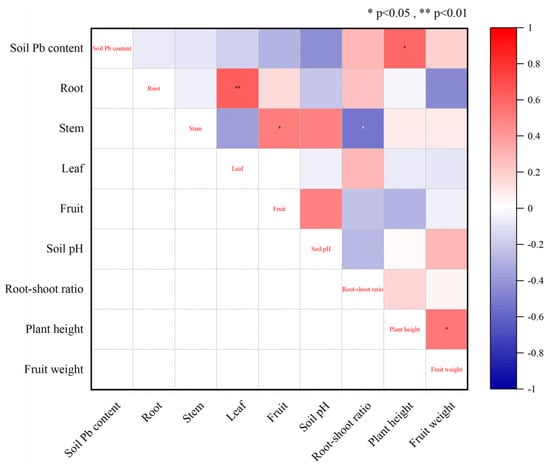 The correlation analysis of various indicators of soil and PLI is shown in Figure 4. The Pb content of PLI roots is significantly positively correlated with the Pb content of leaves, and the Pb content of PLI stems and fruits is significantly positively correlated. The ratio of PLI stem to root and shoot showed a significant negative correlation; soil Pb content was significantly positively correlated with plant height, and plant height was significantly positively correlated with fruit weight.